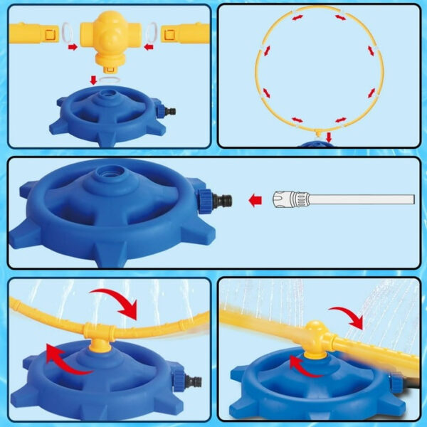 | Sistema Giratório de Jatos | O produto lança jatos de água em 360°, formando um arco ou túnel refrescante. | Conecte à mangueira e ligue a água. As crianças correm e pulam por dentro do arco. |