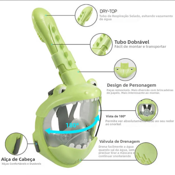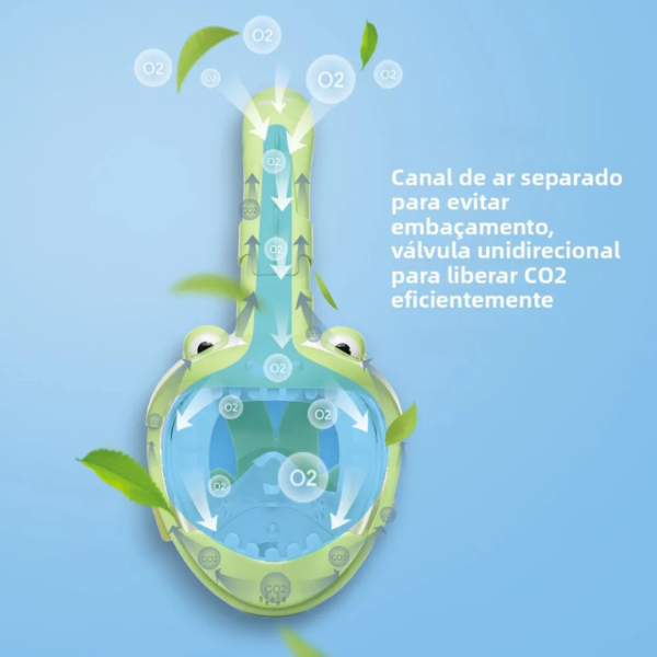 Esta máscara elimina as barreiras do mergulho tradicional, tornando-a ideal para iniciantes (4 a 10 anos).